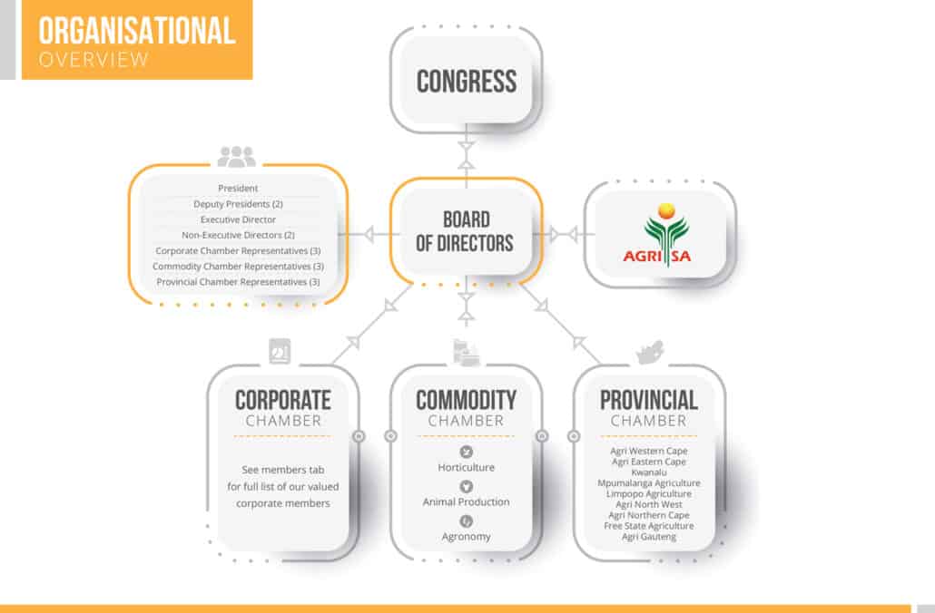 The highest authority of Free State Agriculture is vested in the annual Congress. The executive management is elected out of the Congress and it consists of the President, Vice-president and regional representatives from all 20 municipal regions. The executive management also includes representatives of several affiliated agricultural businesses and industries.